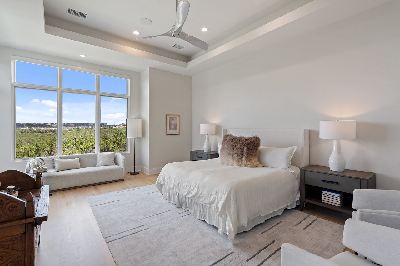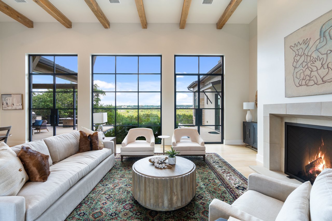 The floor-to-ceiling steel windows frame the picturesque Hill Country terrain, creating a stunning backdrop for the impressive great room. This space boasts soaring beamed ceilings and white oak floors and offers breathtaking horizon vistas.