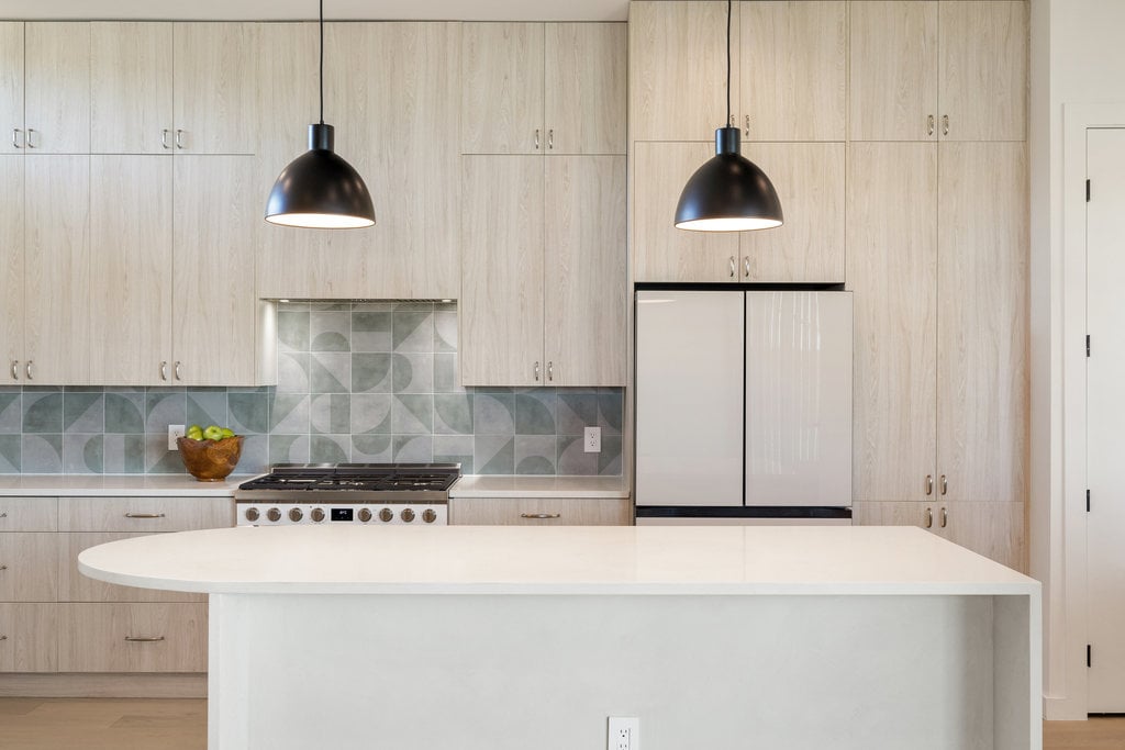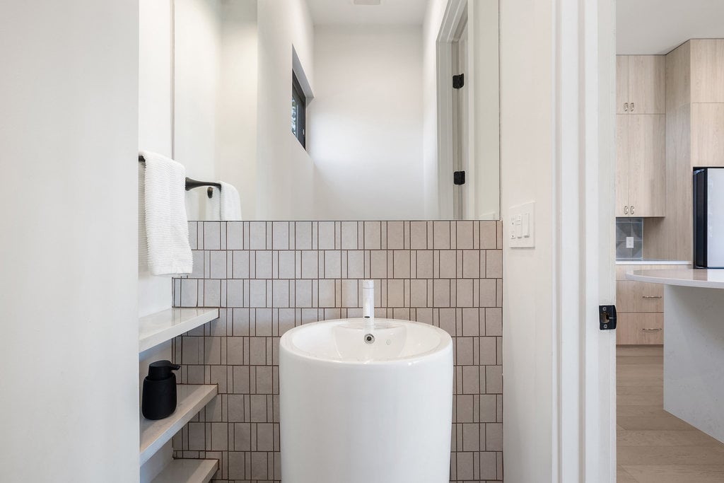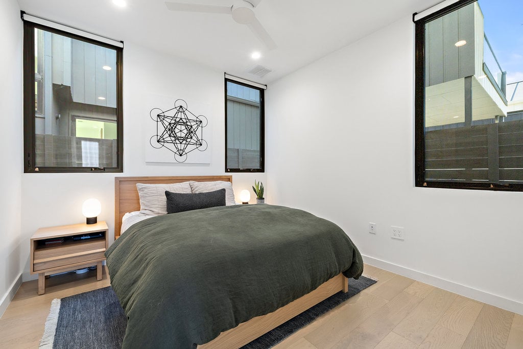 • Other Interior Features: Primary on Main Level, Guest Bedroom and Bath on Main Level, Open Floor Plan, Automatic Shades in Bedrooms and Living Room, Powder Bath, High Ceilings, Vaulted Ceilings, Ceiling Fans, Recessed Lighting, Banquette Seating, Center Island with Seating, Designer Tiles and Materials, Wood Floors, Built-In Desk, Large Picture and Casement Windows